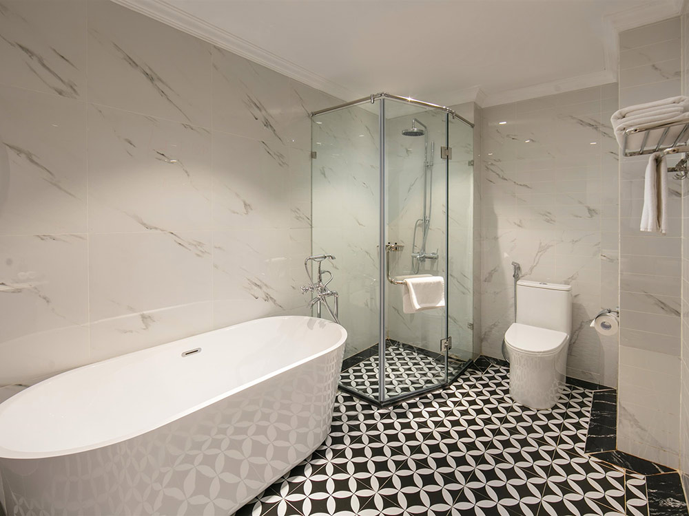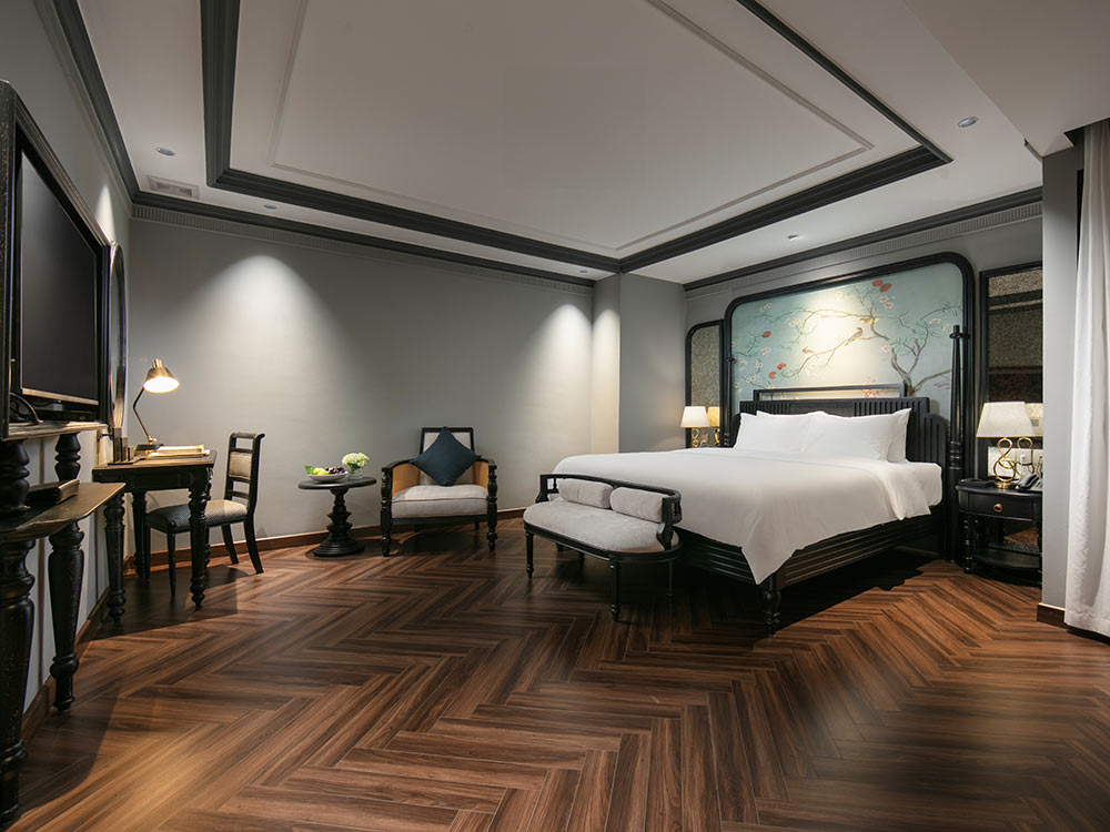 The Deluxe Internal Window room offers a cozy and private retreat, featuring a window facing the interior of the hotel for a peaceful and quiet stay. Thoughtfully designed with modern interiors, the room is fully equipped with premium amenities including a comfortable bed, flat-screen TV, minibar, and a stylish bathroom—perfect for guests seeking relaxation in the heart of Hanoi.
